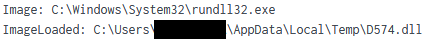 This initiates a connection to 64.227.65[.]60:443 and invokes a Svchost.exe, followed by a lookup to myexternalip[.]com to retrieve the external public-facing IPv4 address of the network. The attacker could use this information to verify the network being targeted and/or to facilitate tool configuration. Two DLLs were loaded via RunDll32 using the Svchost process. The first was D574.dll: