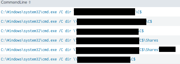 Even though the intrusion lasted for five days total, Cobalt Strike and hands-on keyboard operators showed up in the first two hours of the intrusion. Straight away, they started gathering information to get the lay of the land using Net commands. Then they continued looking for open shares by executing the PowerView module, Invoke-ShareFinder.