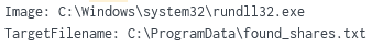 The output file was created at c:\ProgramData\found_shares.txt. The use of this tool has been observed in other recent intrusions. PowerShell was invoked by the WinLogon process and the resulting file created by Rundll32.exe