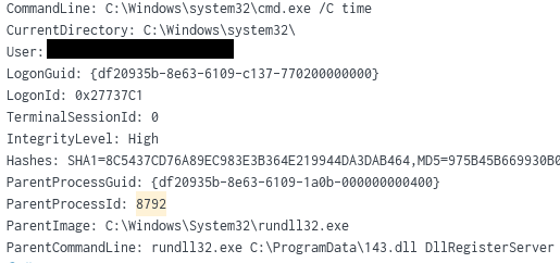 Cmd.exe process invoked a lot of the commands with unusual parent processes such as RunDLL32.exe. The example below using the time command: